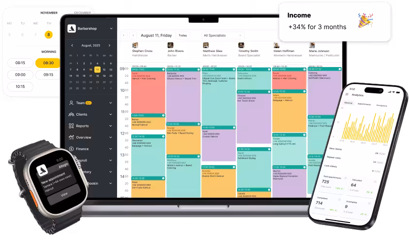 Alteg.io-ն բարձրացնում է ձեր բիզնեսի արդյունավետությունը՝ առաջարկելով առաջադեմ առցանց ամրագրում, հաղորդակցություն, գրաֆիկների կառավարում, թիմի կառավարում, ֆինանսական հաշվառում, պաշարների վերահսկում և ավելի քան 30 մոդուլ՝ մեկ կայուն և հուսալի հարթակում։